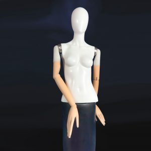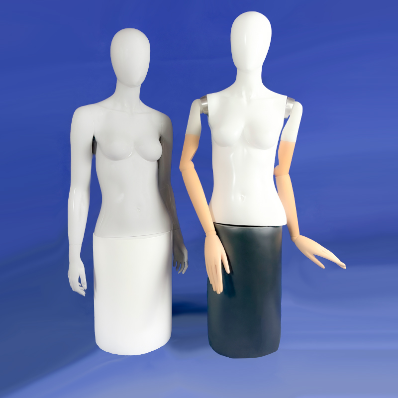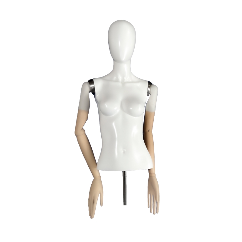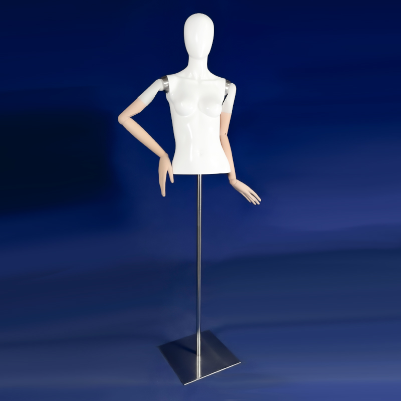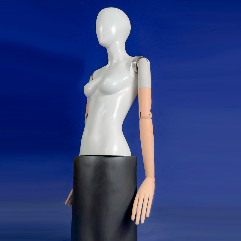 Nuestro busto de mujer con brazos articulados es perfecto para personalizar tus prendas y destacar tu escaparate. Disponible en color blanco con opción de personalizar el acabado para alquiler y venta sostenible. Con base de apoyo personalizable para una presentación única.